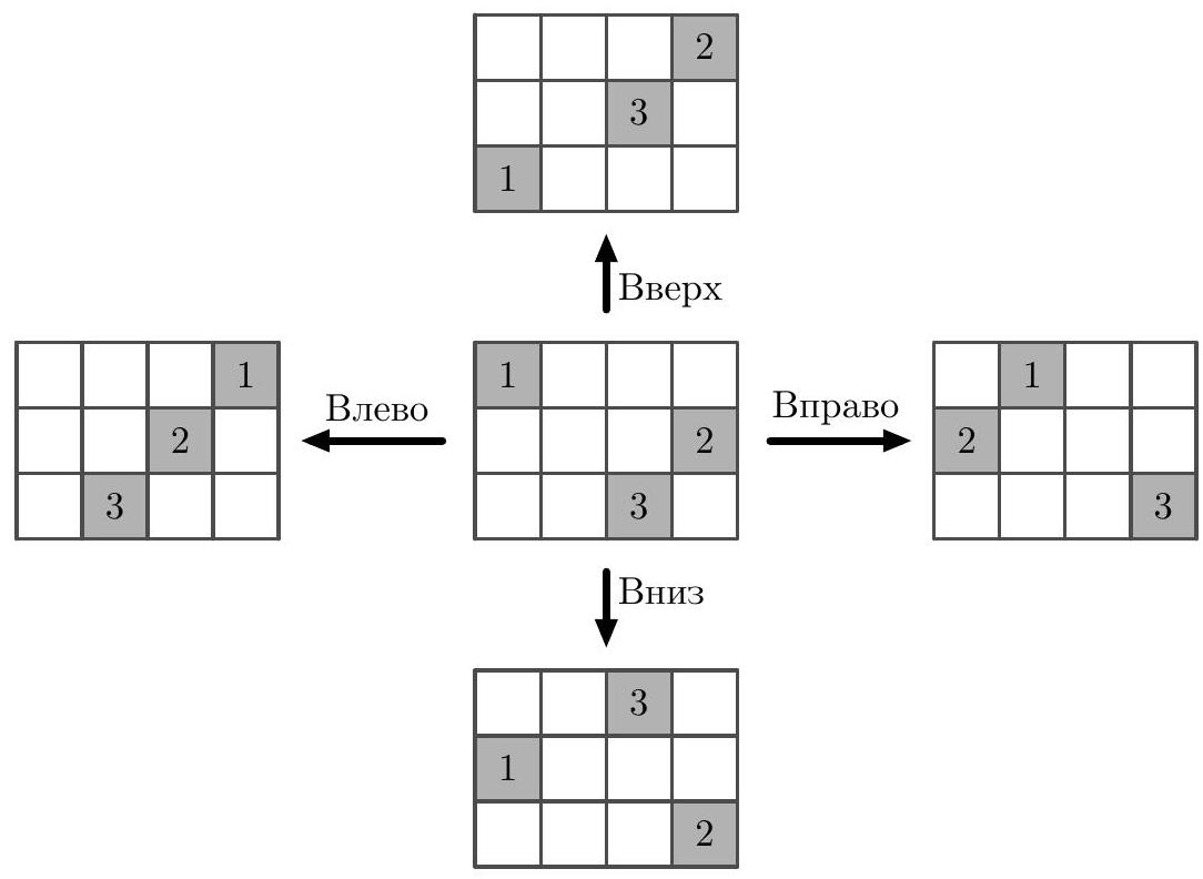下图是一个有 行 列的网格,其中有三个格子显示了画面,它们的坐标分别是 。图中还展示了按下每个按钮后,这些画面会移动到哪里。