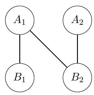 此时,0 号桥连接 A1 和 B1,1 号桥连接 A1 和 B2,2 号桥连接 A2 和 B2。选择 0 号桥和 2 号桥维修,可修最多 2 座桥,且这种方案只有 1 种。函数应返回 [2,1]。若返回 [2,−1] 或 [2,0] 等,仅正确返回数量,分数按部分计。