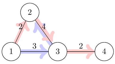下图展示了样例中的 Bajtogród 路网。圆圈表示路口,圆圈内的数字是路口编号;线条表示道路,线条旁的数字是经过该道路的行车时间。第 条公交线路的路线用红色标记,第 条公交线路的路线用蓝色标记。