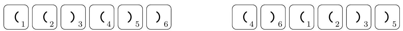 例如,对于 张卡牌,洗牌后的排列为 ,可以在卡牌上画括号,使得洗牌前卡牌形成括号序列 (())(),洗牌后形成括号序列 ()()()。