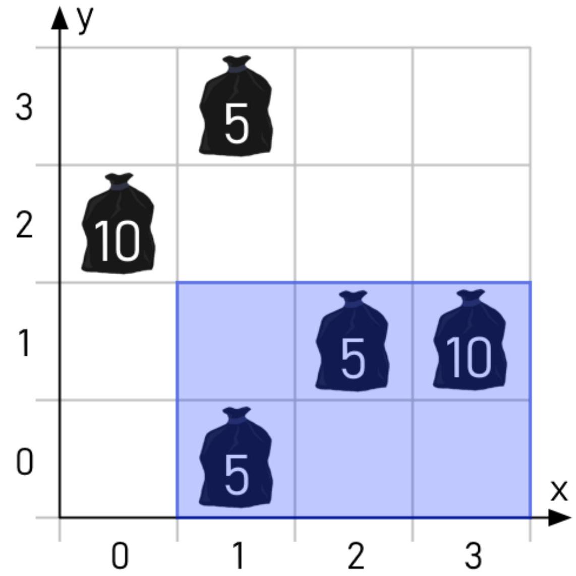 最佳的清理区域应覆盖坐标为 (3,1)、(2,1) 和 (1,0) 的垃圾,总重量为 10+5+5=20。