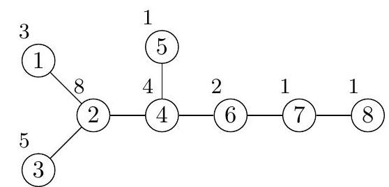 该样例满足七座城市构成一棵满二叉树,每座城市的吸引力系数等于其所在深度(根节点深度为 )。